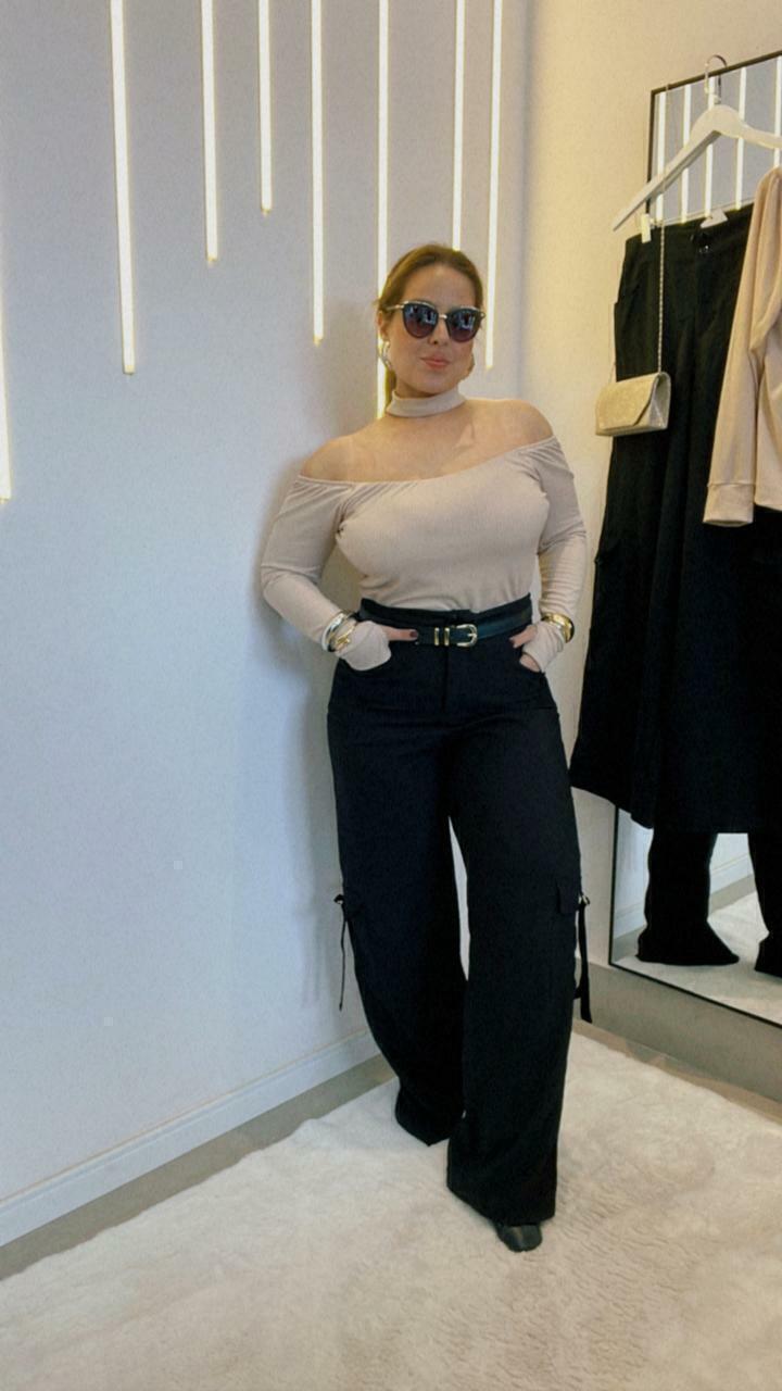 Esta blusa em malha canelada traz um design moderno e elegante com gola alta e modelagem off shoulder (ombro a ombro), valorizando o colo de forma sutil e estilosa. Ideal para composições versáteis, do casual chic ao look noturno.